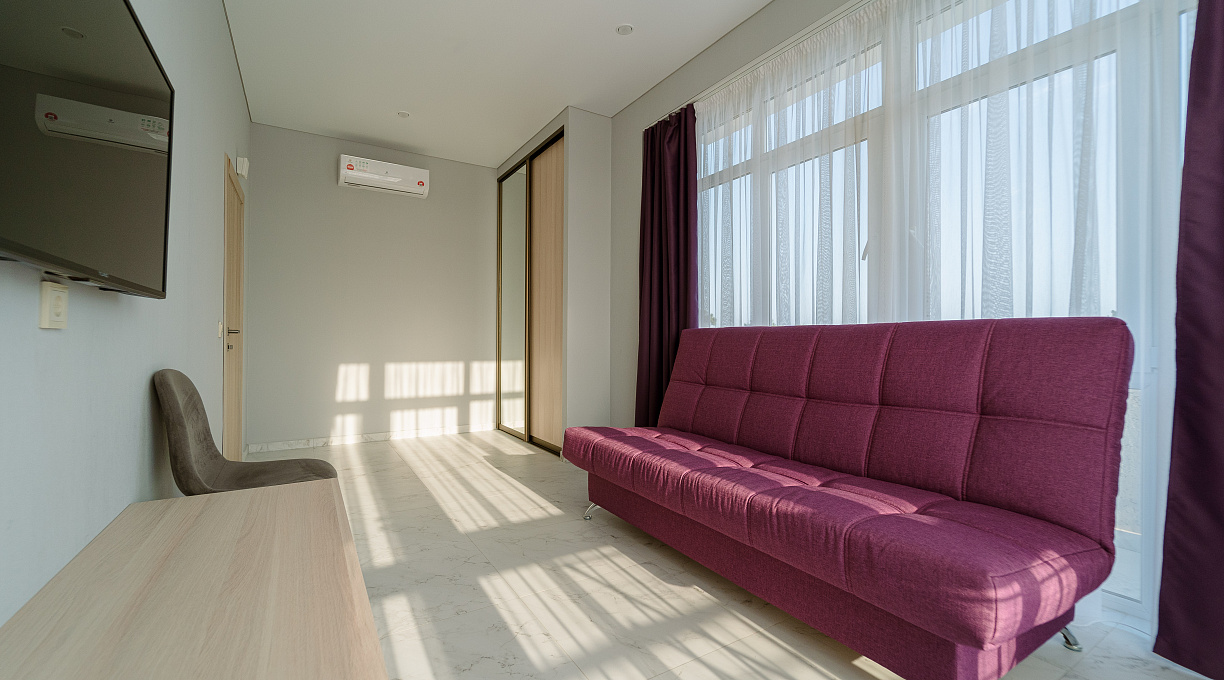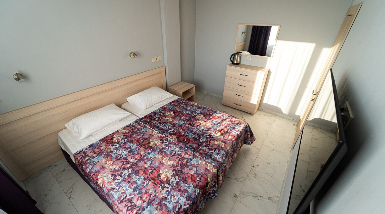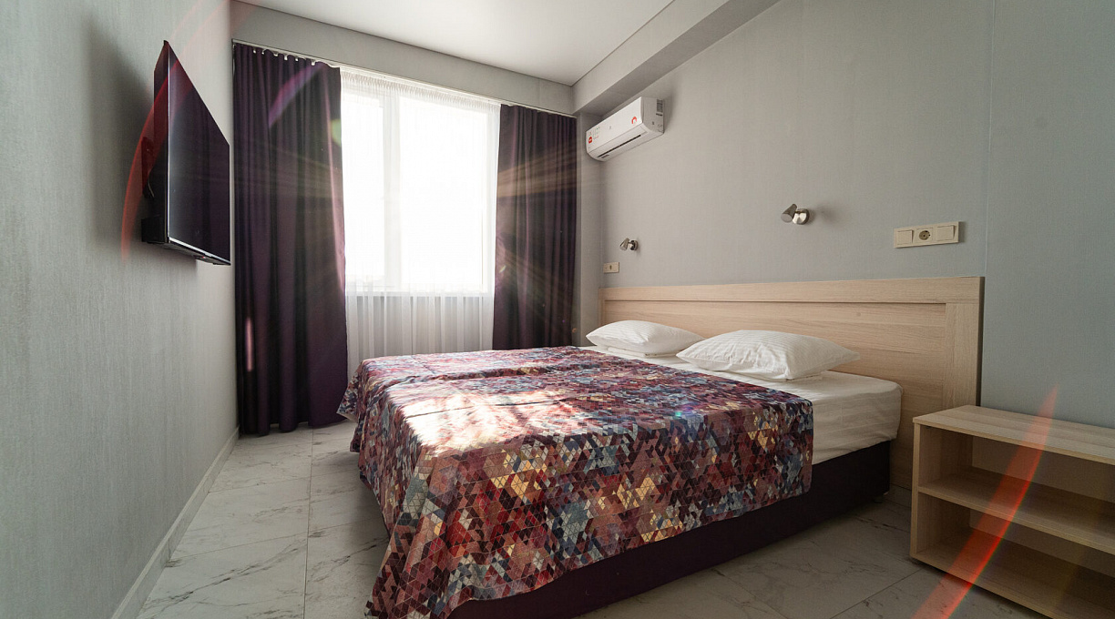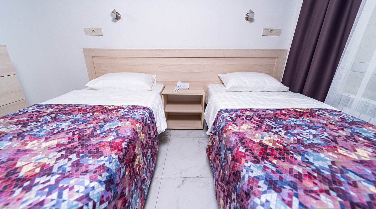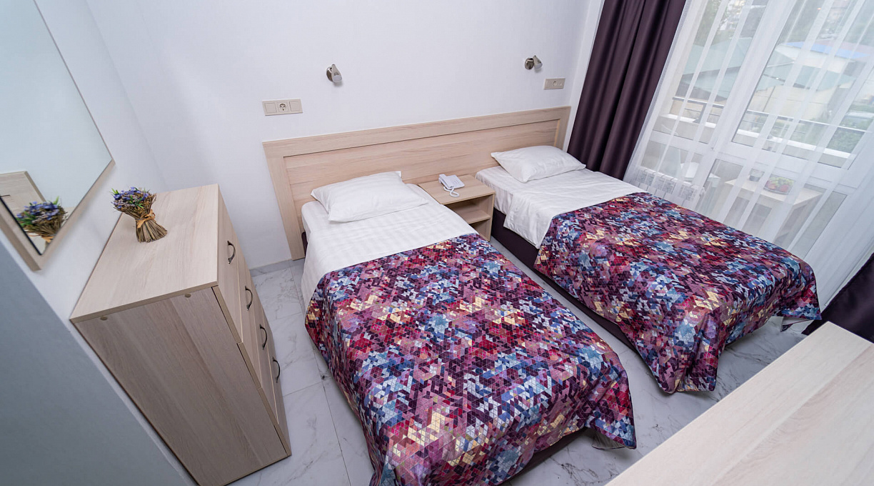 Просторный номер с видом на пешеходную улицу Петербургская. Каждый номер оснащен кондиционером, телевизором, шкафом для одежды, телефоном, феном. Ванная комната с ванной или душевой и банными принадлежностями. В номере две кровати или большая двуспальная кровать, есть возможность разместить дополнительного гостя на отдельной кровати. Завтрак включен в стоимость.