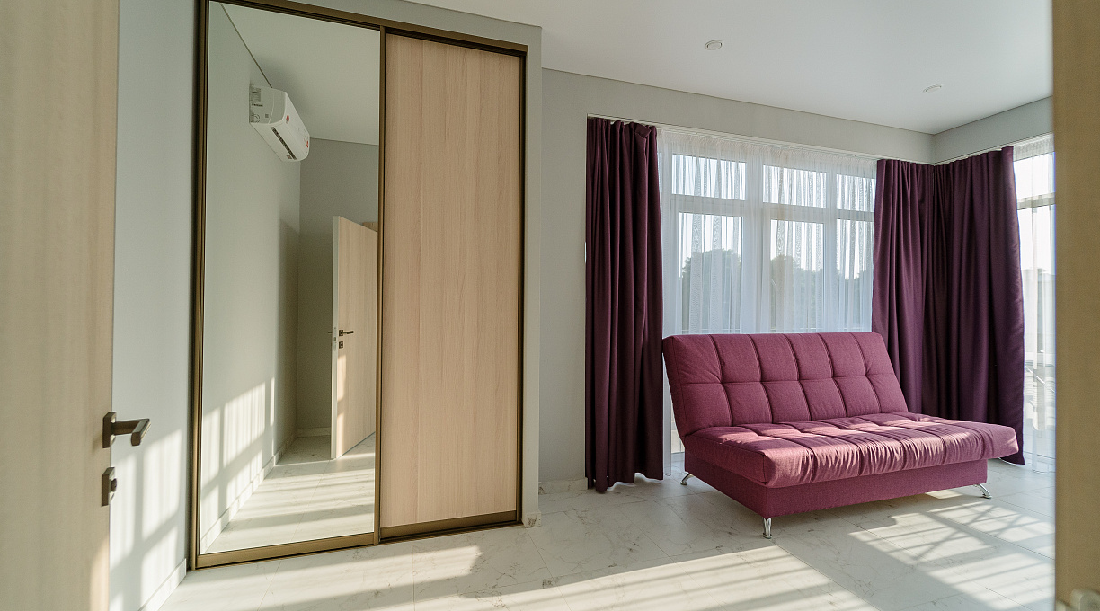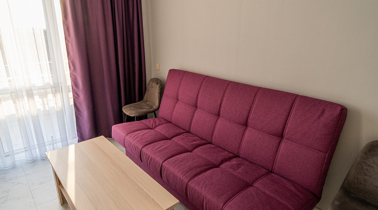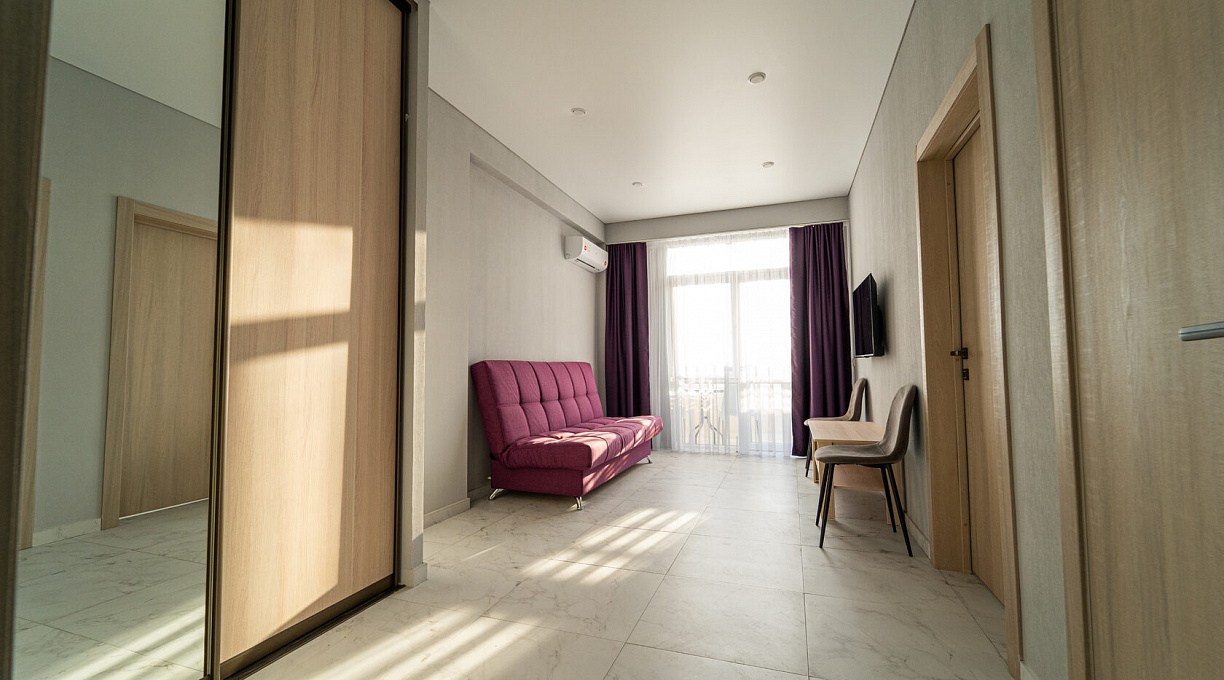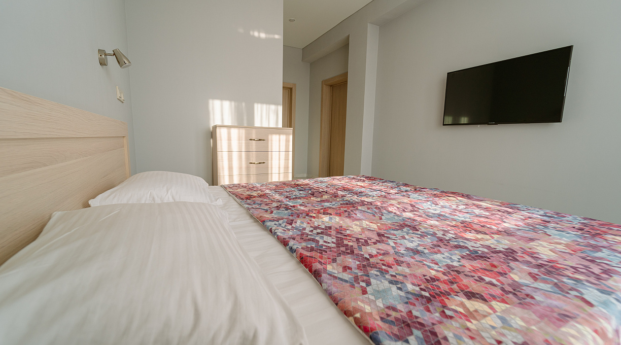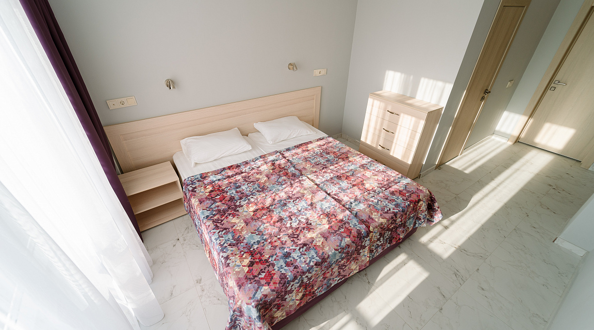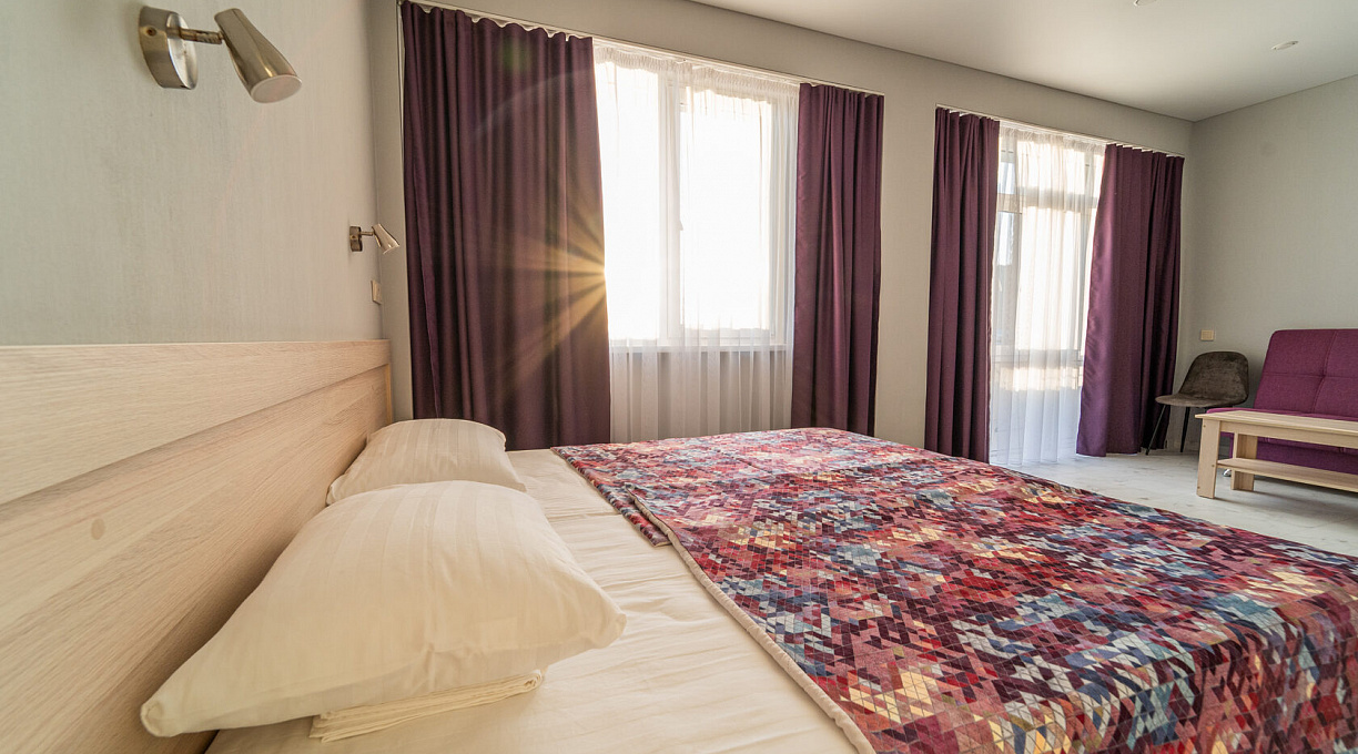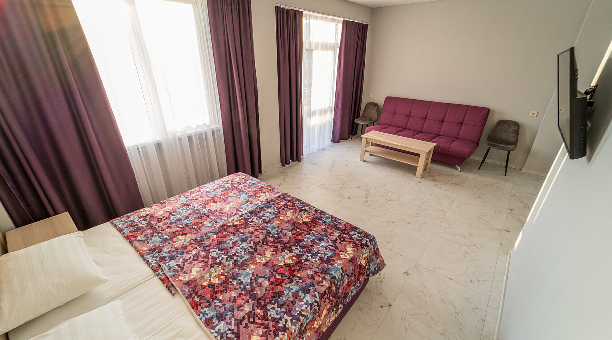 Просторный двухкомнатный номер со спальней и залом. Вид на сосновую рощу или горы. В каждом номере фен, телевизор, кондиционер, холодильник, чайник, сейф. Ванная комната с душем и банными принадлежностями. В номере одна большая кровать, раскладной диван в зале, удобное зеркало, обеденный стол.